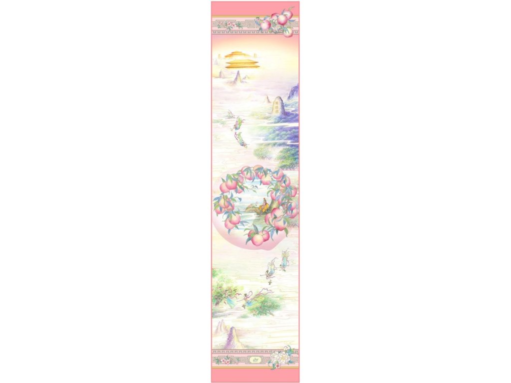 Šála Broskve nesmrtelnosti je inspirována oblíbenou postavou z představení Shen Yun, Opičím králem, a jeho láskou ke kouzelným broskvím, které pěstuje Královna matka nebes. Tyto zvláštní broskve dozrávaly jen jednou za několik tisíc let a těm, kdo je jedli, poskytovaly nesmrtelnost. Zvědavý a zlomyslný Opičí král způsobil v nebeské říši rozruch, když byl přistižen, jak hoduje na broskvích víl sběraček ovoce, které poslala Královna matka.