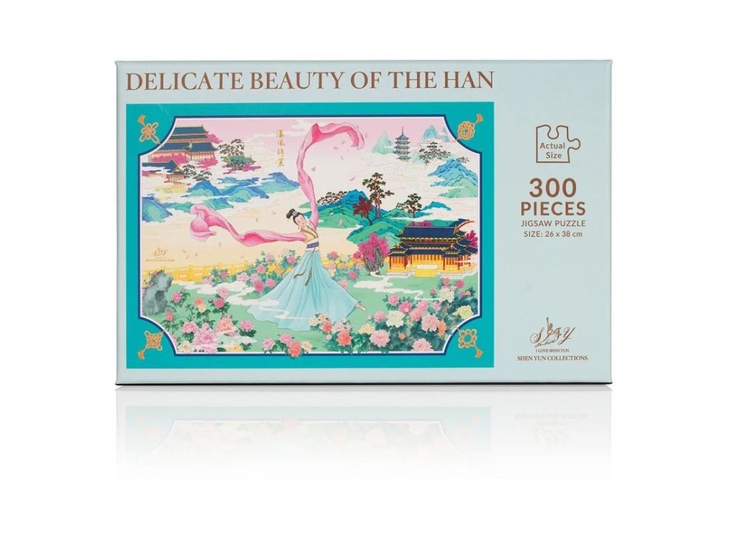 Toto 300dílné puzzle, inspirované dílem Shen Yun Jemná krása Han, vás zavede do císařské pivoňkové zahrady během zlatého věku čínské historie. Tam se nachází tančící dívka, která zdobí scenérii svými dlouhými splývavými rukávy. Jemné odstíny růžové a broskvové doplňuje tyrkysová barva v radostném středu, který je ideální pro každou rodinnou událost.