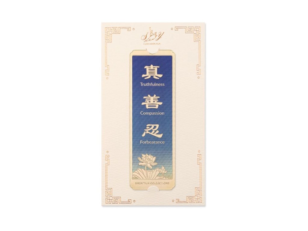 Tato půvabná záložka se třemi elegantními znaky v nádherném designu je poctou pozoruhodným hodnotám Falun Dafa, 真 (žen) Pravdivosti, 善 (šan) Soucitu a 忍 (ržžen) Snášenlivosti, které Shen Yun vyjadřuje ve svých tanečních vystoupeních. Ať vaše každodenní dobrodružství září nádherou, která sahá až k nebesům.